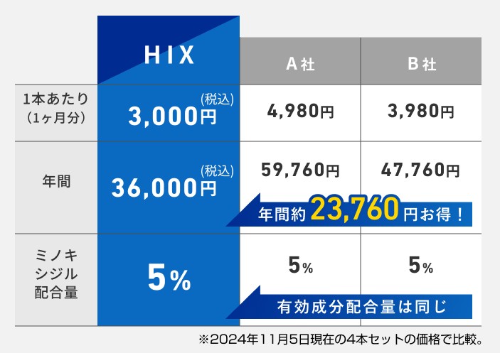 この点では、価格が比較的安いヒックス ミノキシジル5は続けやすいと感じる人が多いようですね。